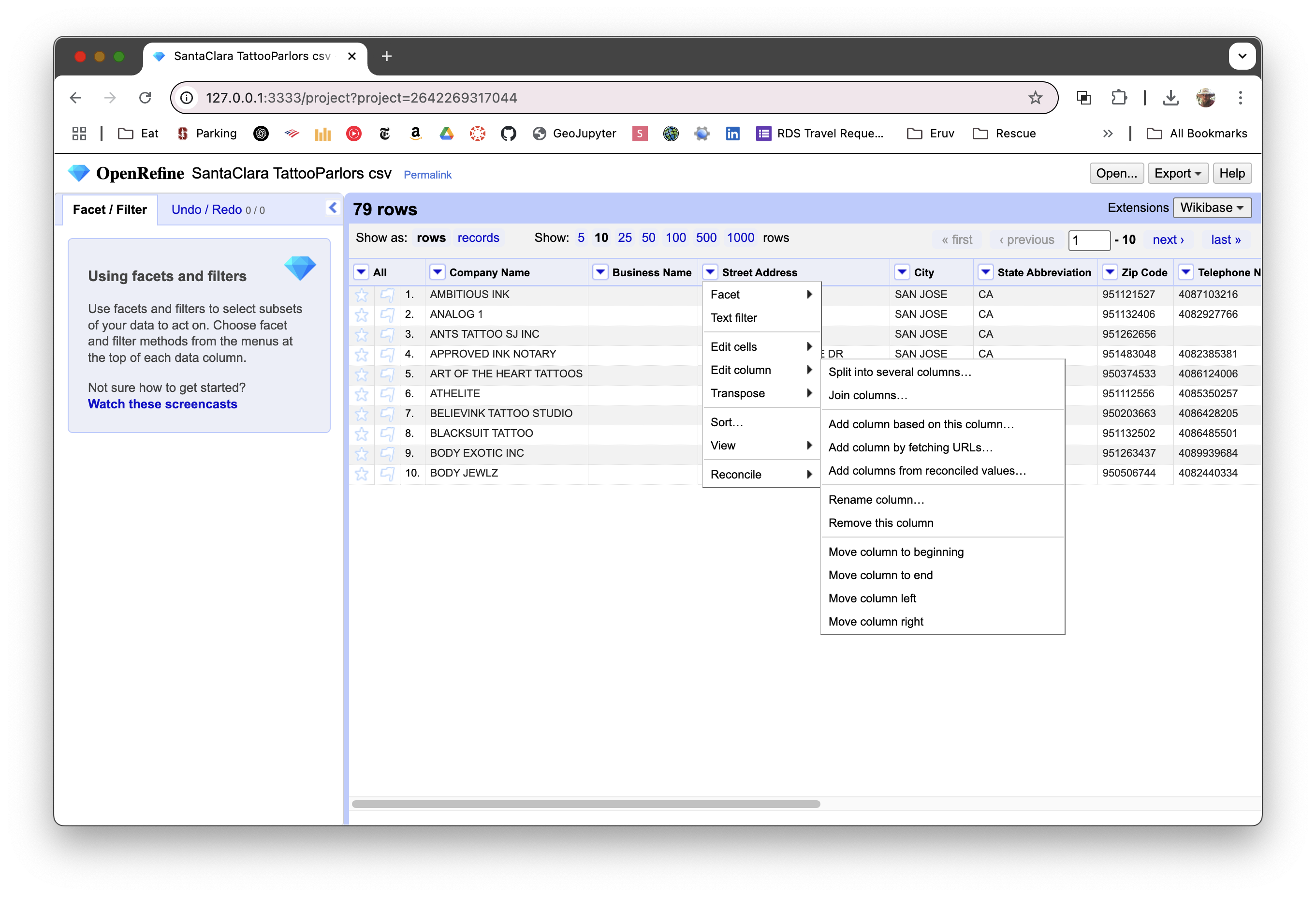 Spend some time exploring the interface. It's beyond the scope of this exercise to explore all of the functionality in OpenRefine, but it's worth you time to learn. A great resource for more exploration of OpenRefine and it's capabilities, is datacarpentry.org's OpenRefine for Social Science Data