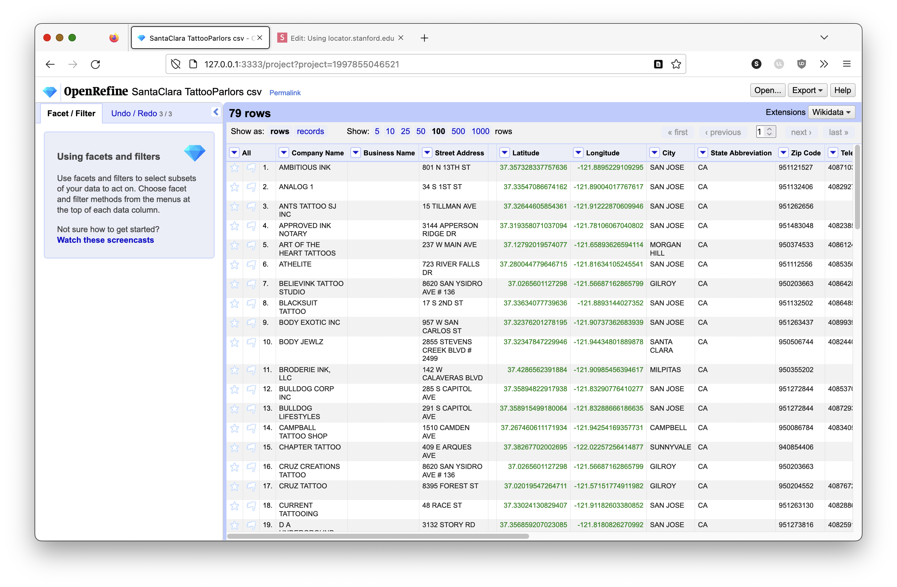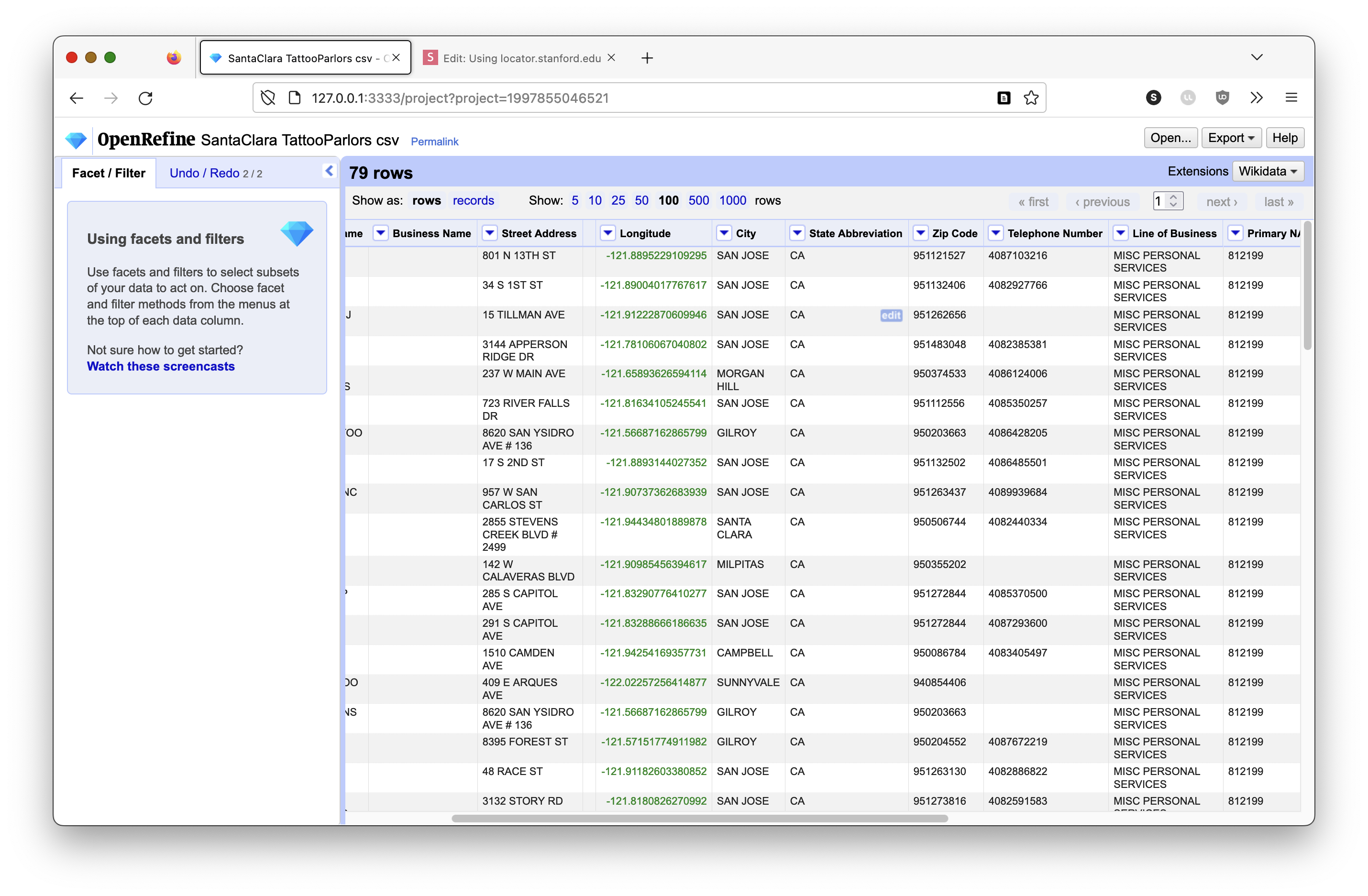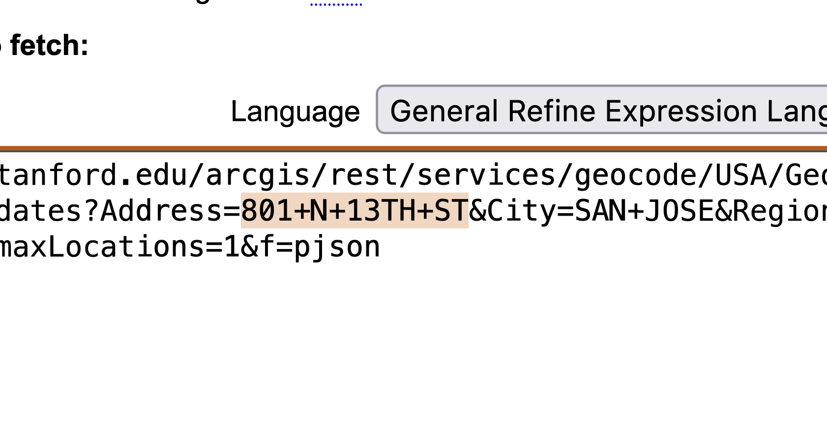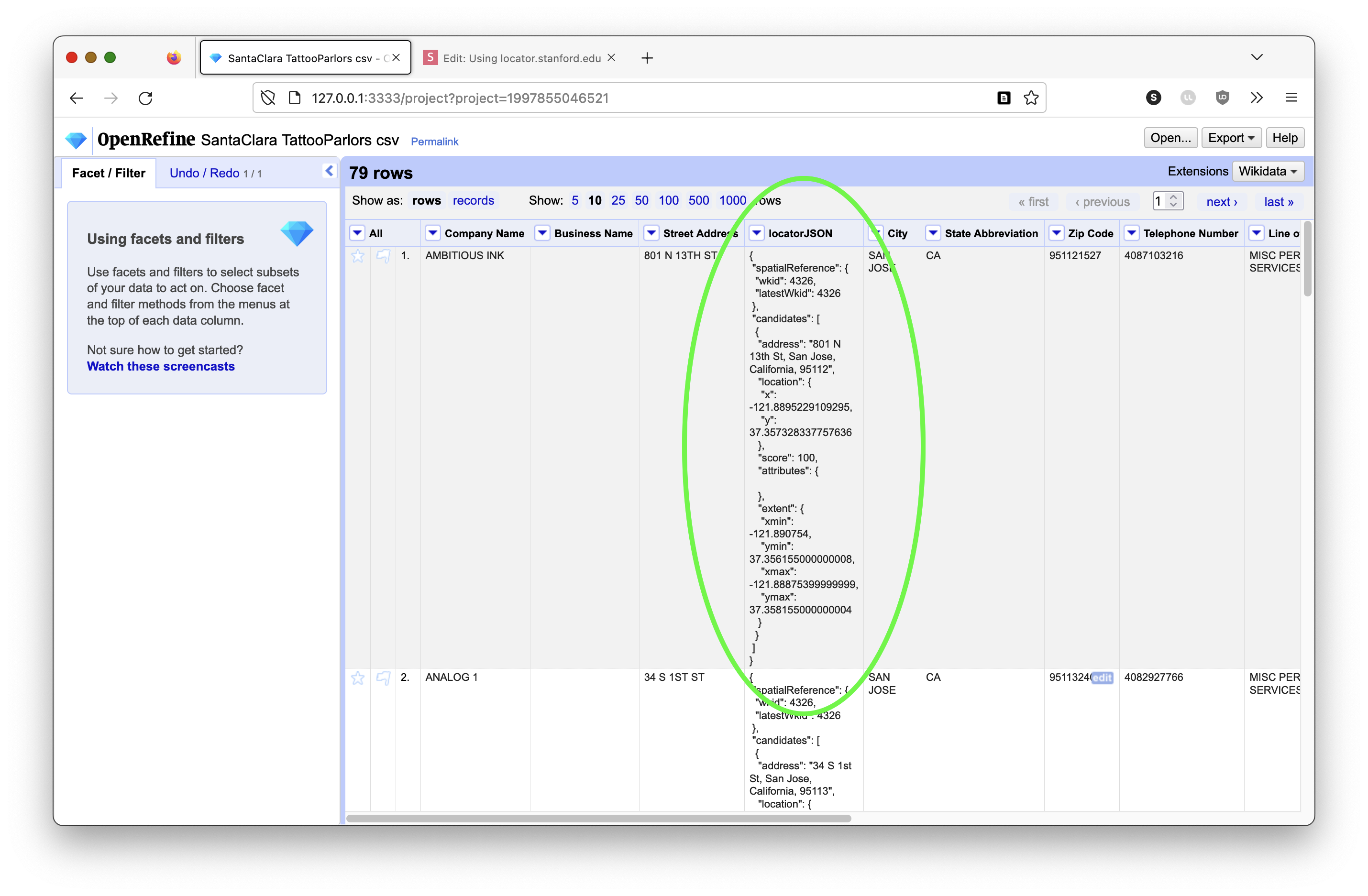 We'll make use of this, later in OpenRefine, to extract the longitude & latitude coordinates from the JSON formatted data we get back from locator.stanford.edu