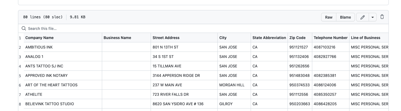 - Now, examine the data we will feed into the APIs, at https://github.com/mapninja/Earthsys144/blob/master/data/SantaClara_TattooParlors.csv