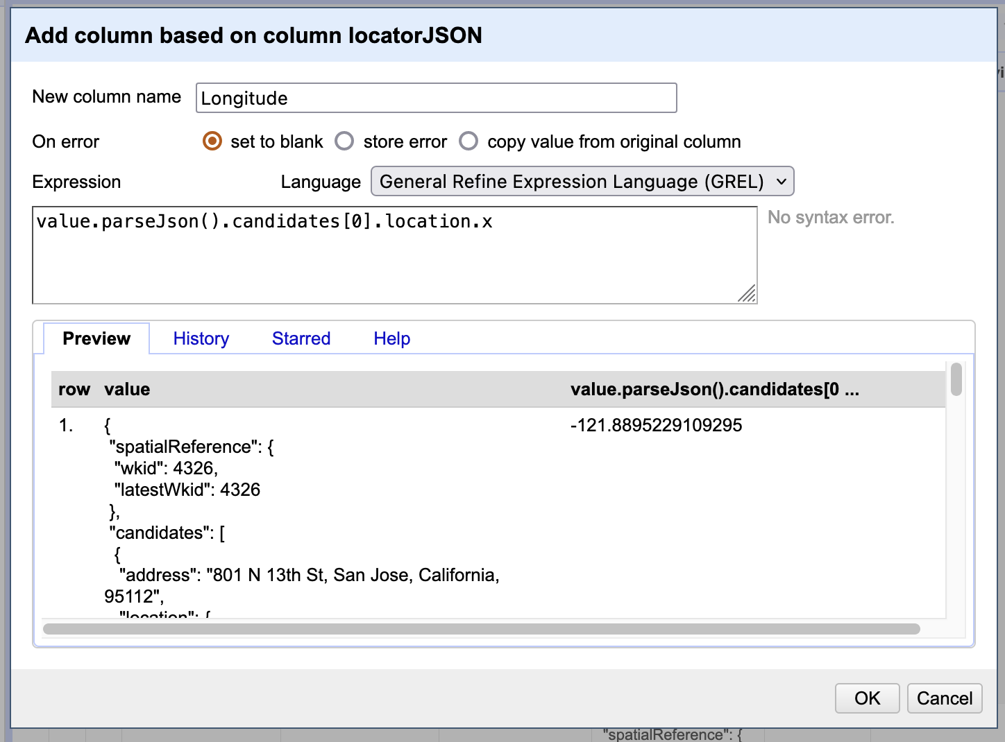 ( Note that in the image, below, I have used the >View>Collapse this column option to hide the rather large locateJSON column, to better display the new Longitude column.)