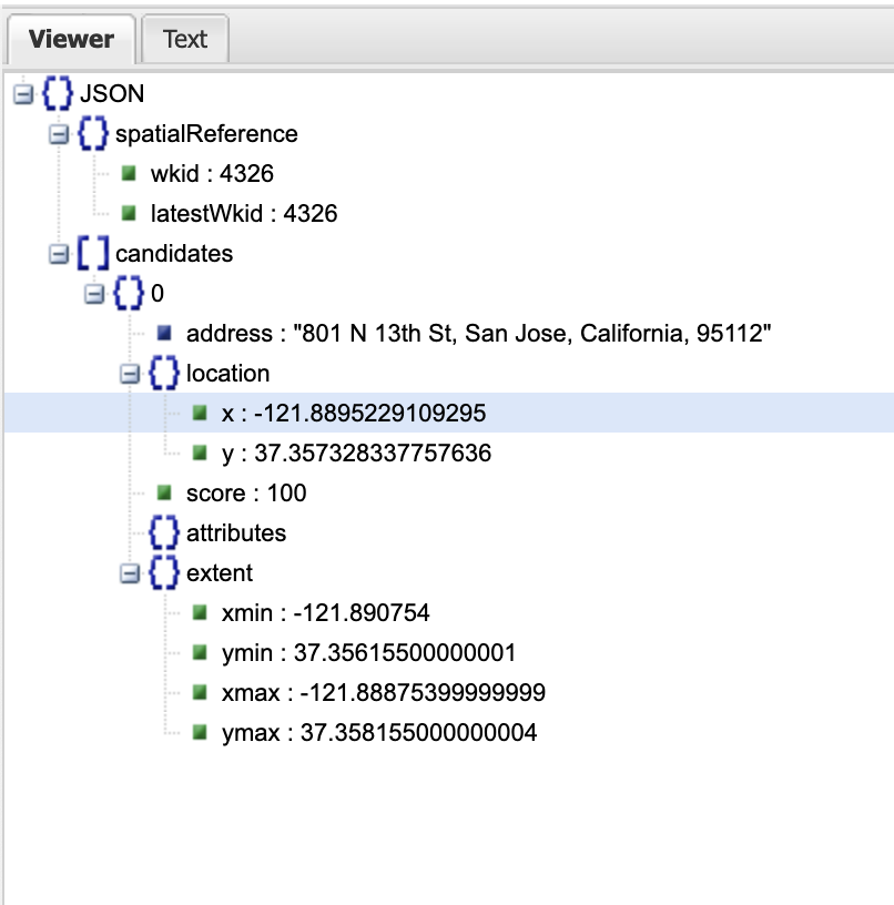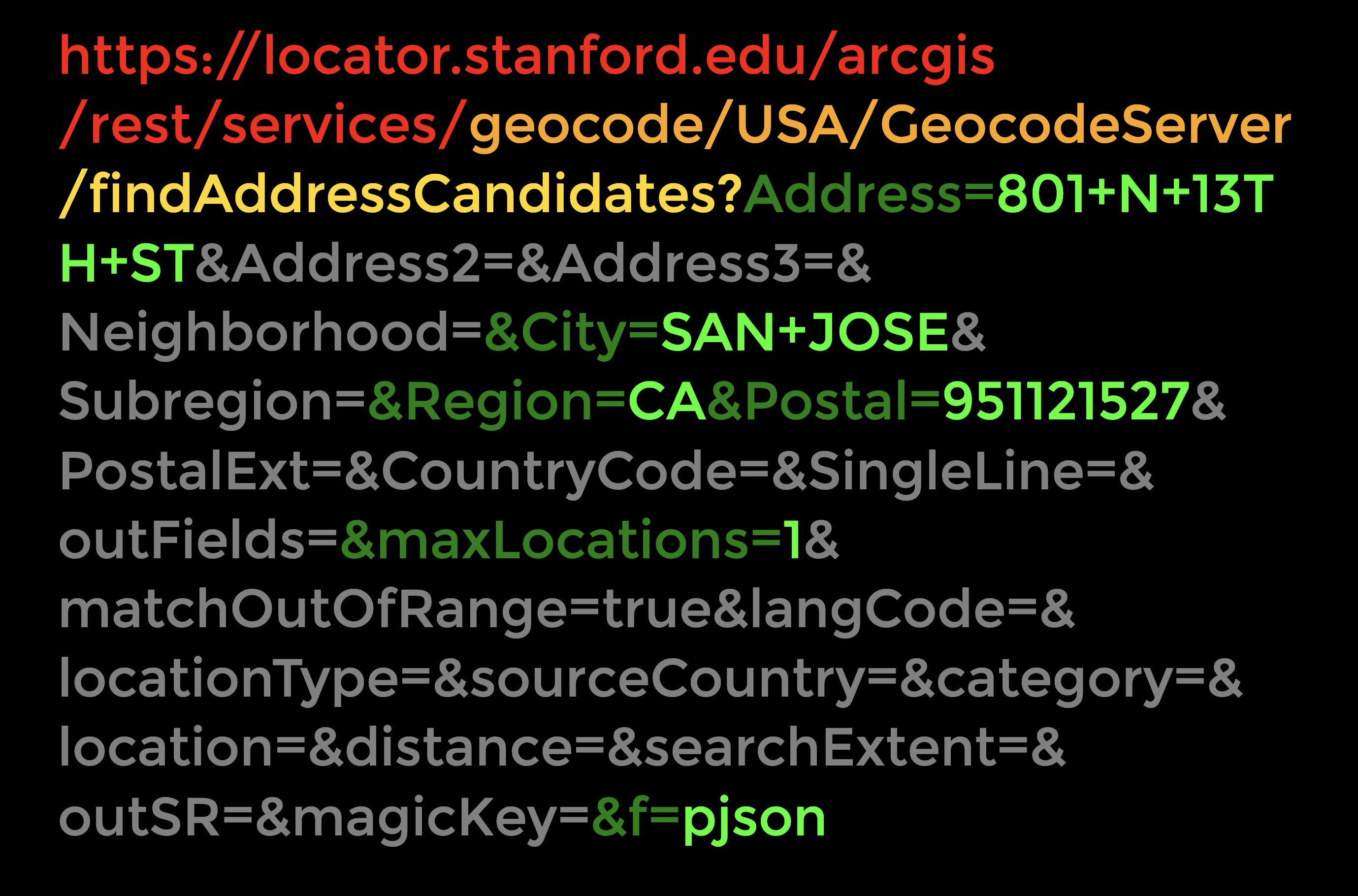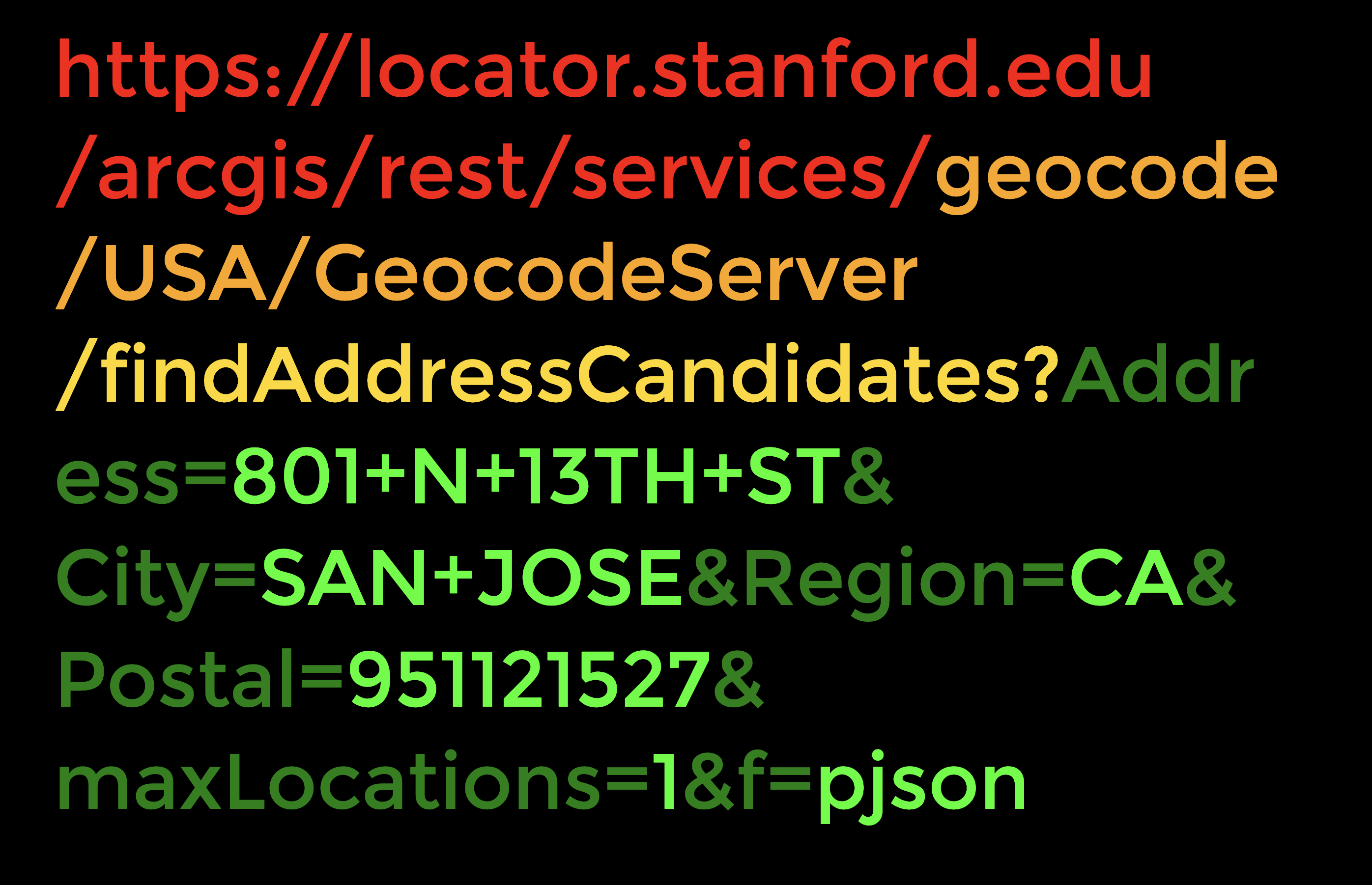 https://locator.stanford.edu/arcgis/rest/services/geocode/USA/GeocodeServer/findAddressCandidates?Address=801+N+13TH+ST&City=SAN+JOSE&Region=CA&Postal=951121527&maxLocations=1&f=pjson