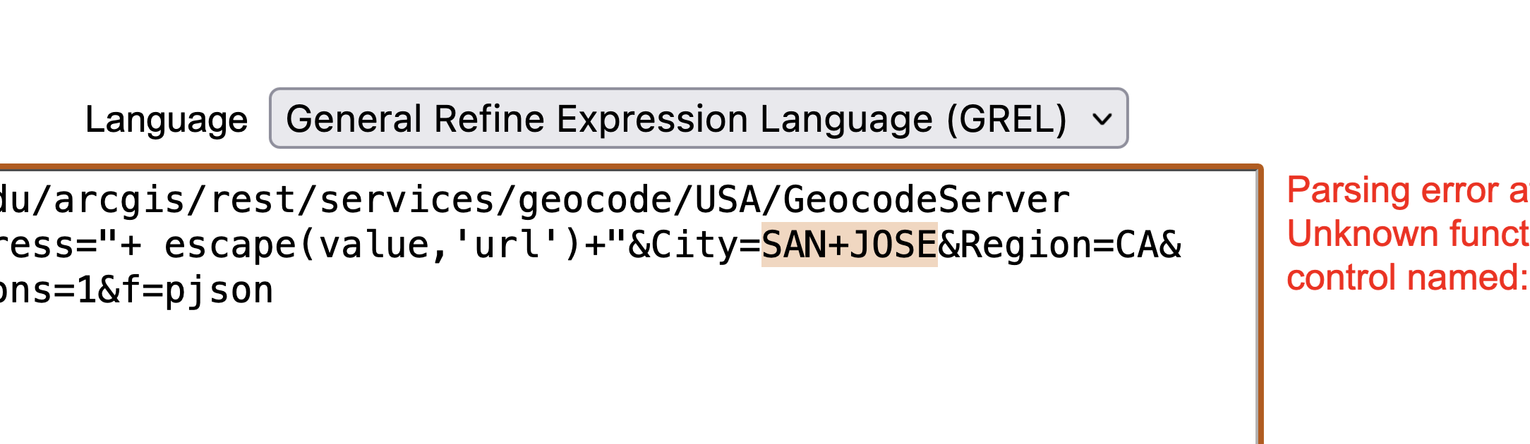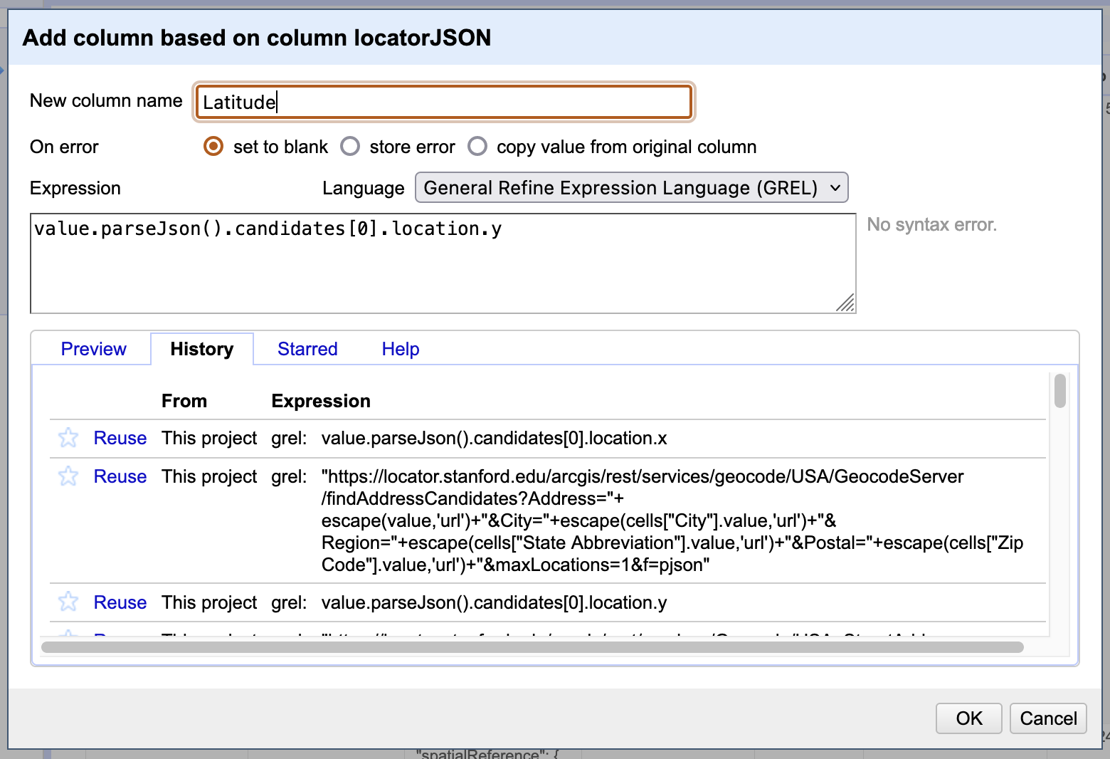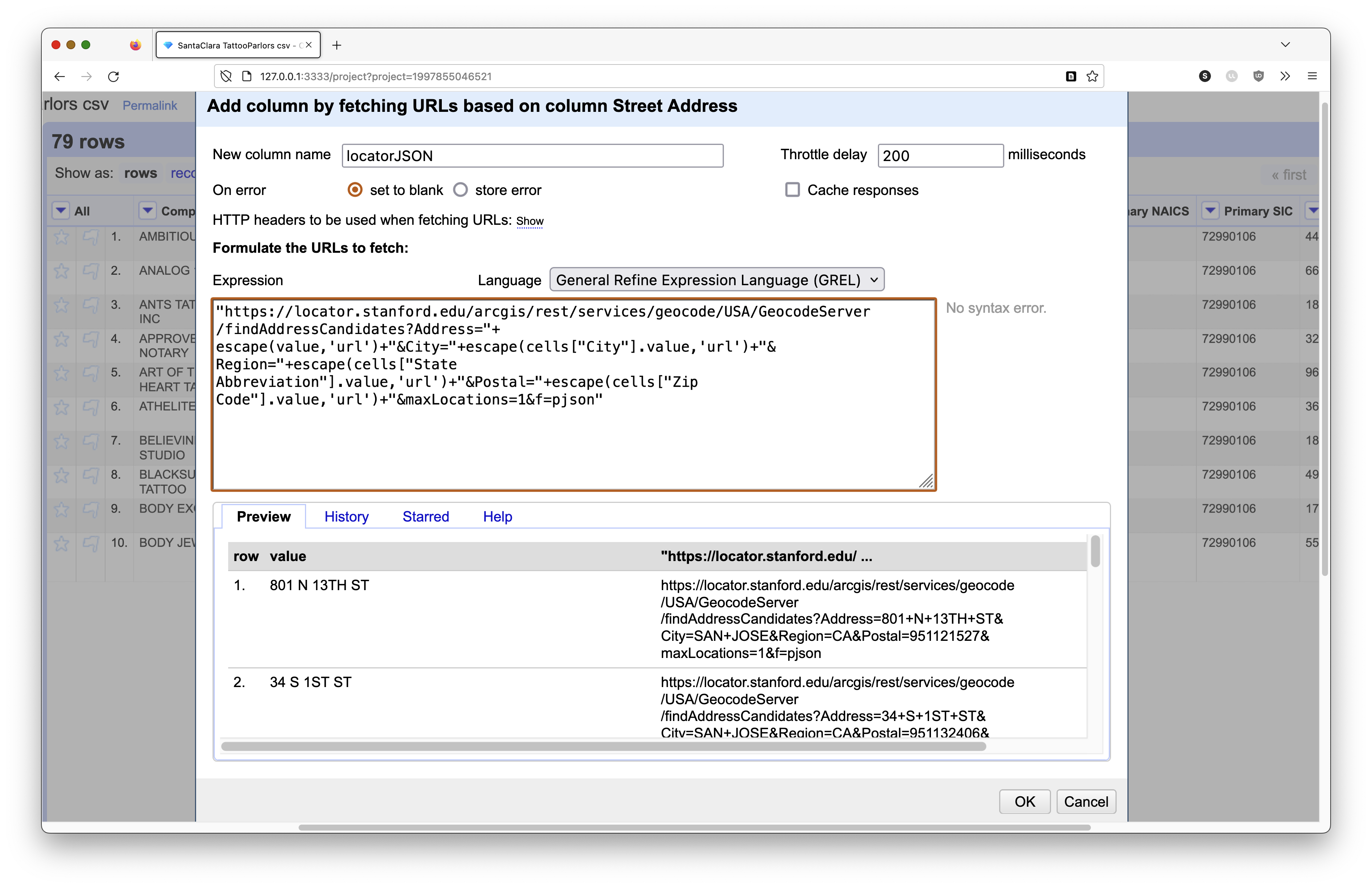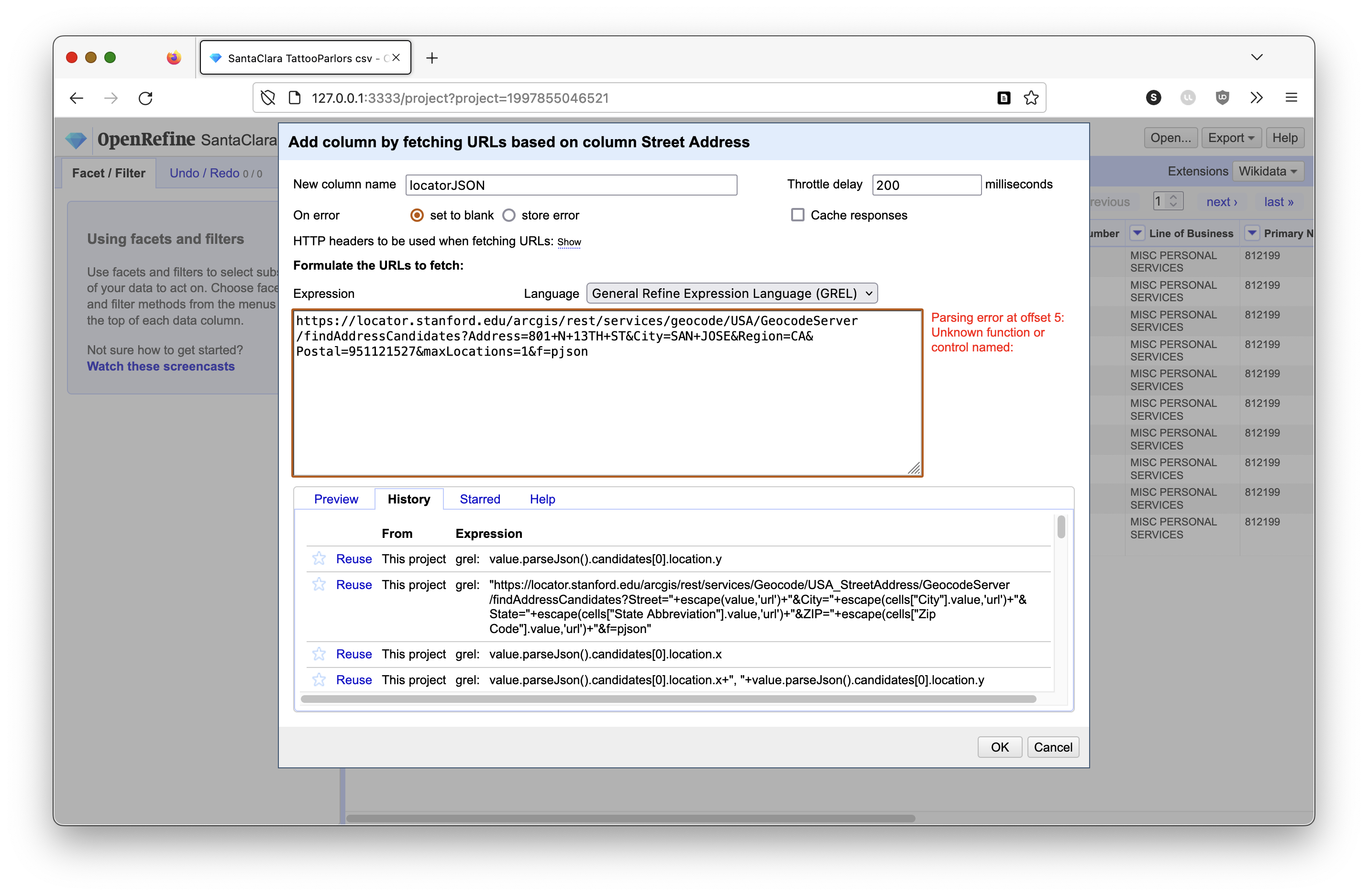 Now it’s time to start up OpenRefine and use the URL we’ve just created to submit a Geocoding Request for each of our addresses.
