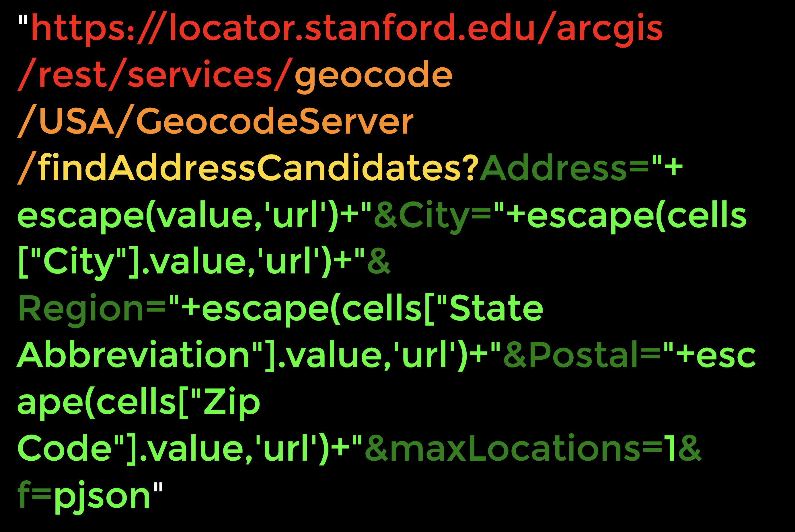 In the Preview Window, you should see the auto-generated endpoint URL with the contents of the columns called Street Address, City, State Abbreviation, and Zip Code inserted for each column.