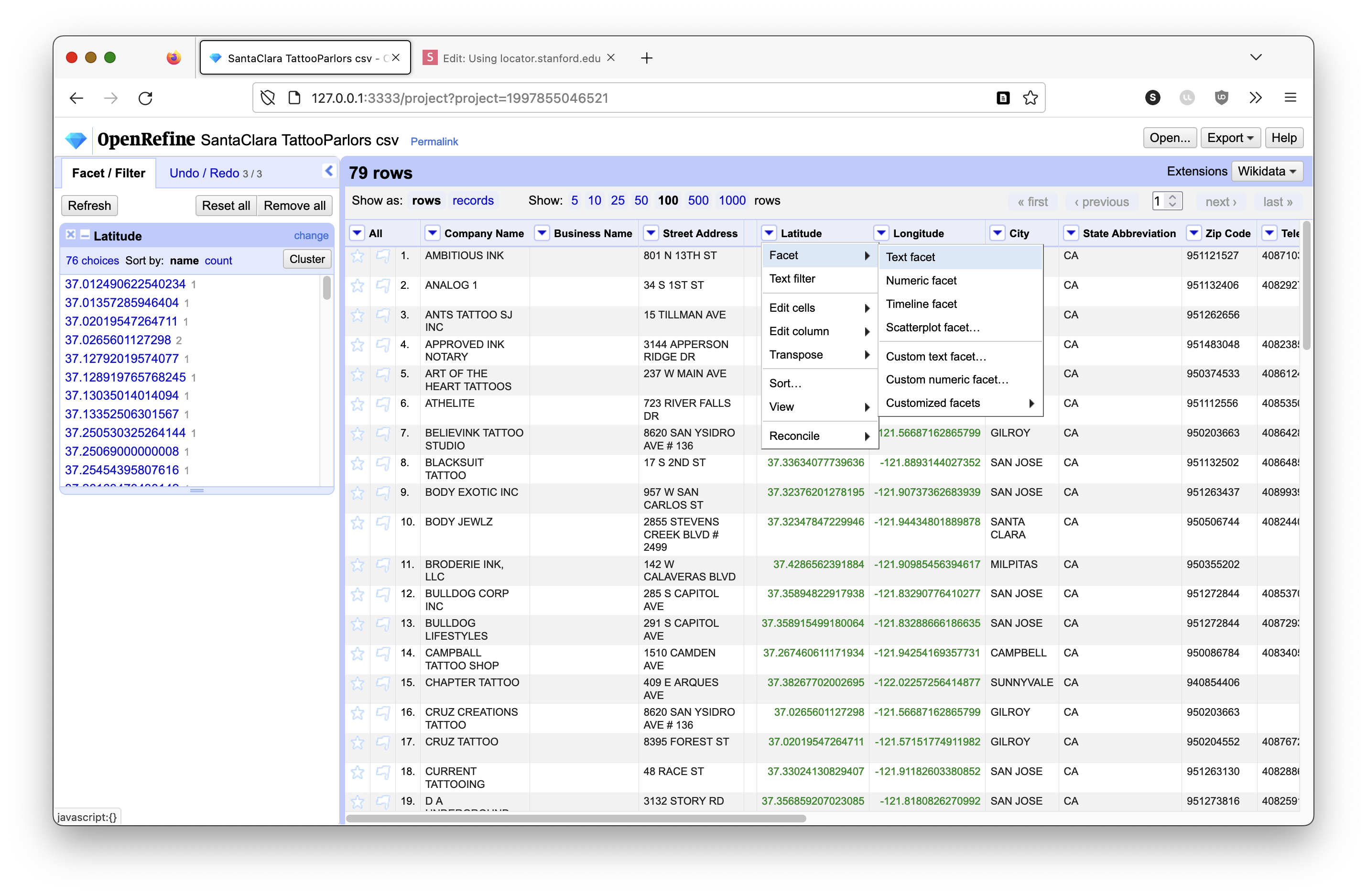 LongitudeorLatitudecolumn, and go to >Facet>Text Facet - Scroll up and down through the resulting Facet/Filter panel that appears on the left side of OpenRefine, to confirm that all of the values in the column are valid coordinates.