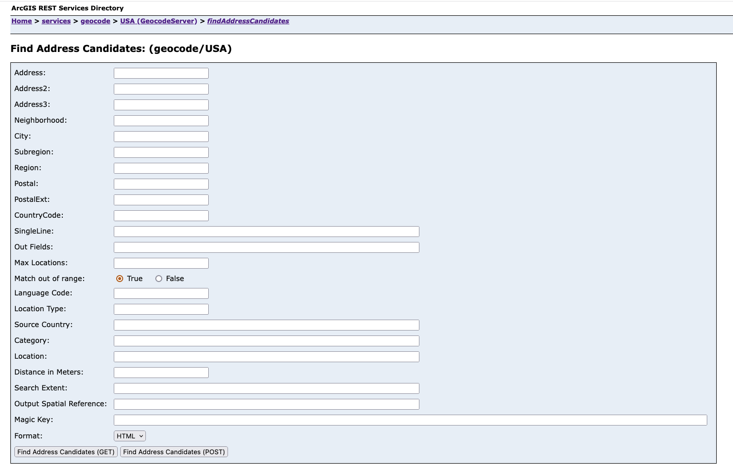 - Scroll to the bottom of the https://locator.stanford.edu/arcgis/rest/services/geocode/USA/GeocodeServer page and look for the Find Address Candidates link and click on it.
