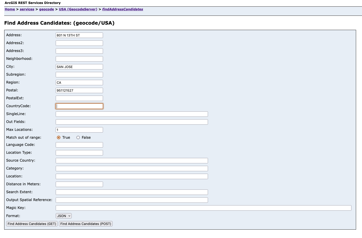 https://locator.stanford.edu/arcgis/rest/services/geocode/USA/GeocodeServer/findAddressCandidates?Address=801+N+13TH+ST&Address2=&Address3=&Neighborhood=&City=SAN+JOSE&Subregion=&Region=CA&Postal=951121527&PostalExt=&CountryCode=&SingleLine=&outFields=&maxLocations=1&matchOutOfRange=true&langCode=&locationType=&sourceCountry=&category=&location=&distance=&searchExtent=&outSR=&magicKey=&f=pjson